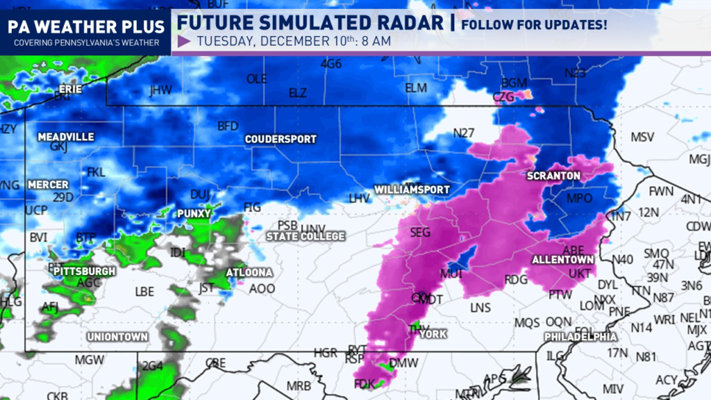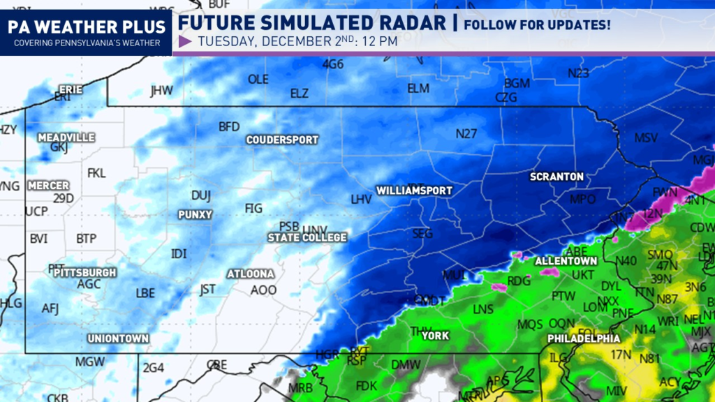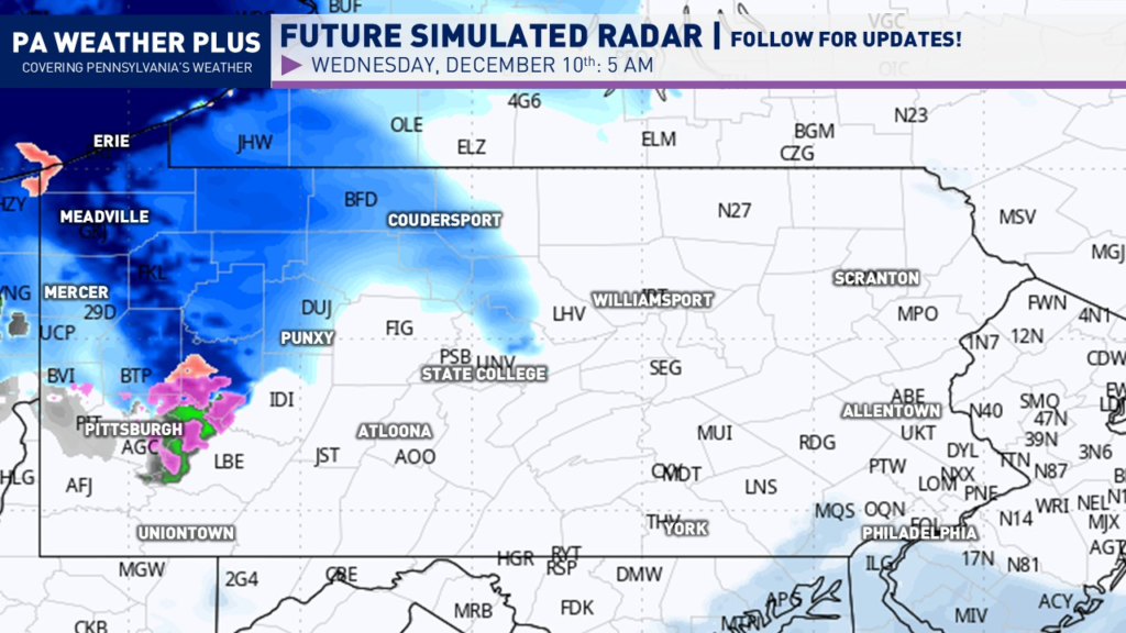 By the time we get to the 7 – 10 AM time range, snow will overspread much of the northern half of the state. A wintry mix is expected for portions of eastern Pennsylvania, and rain/snow showers will continue for southwestern Pennsylvania.
