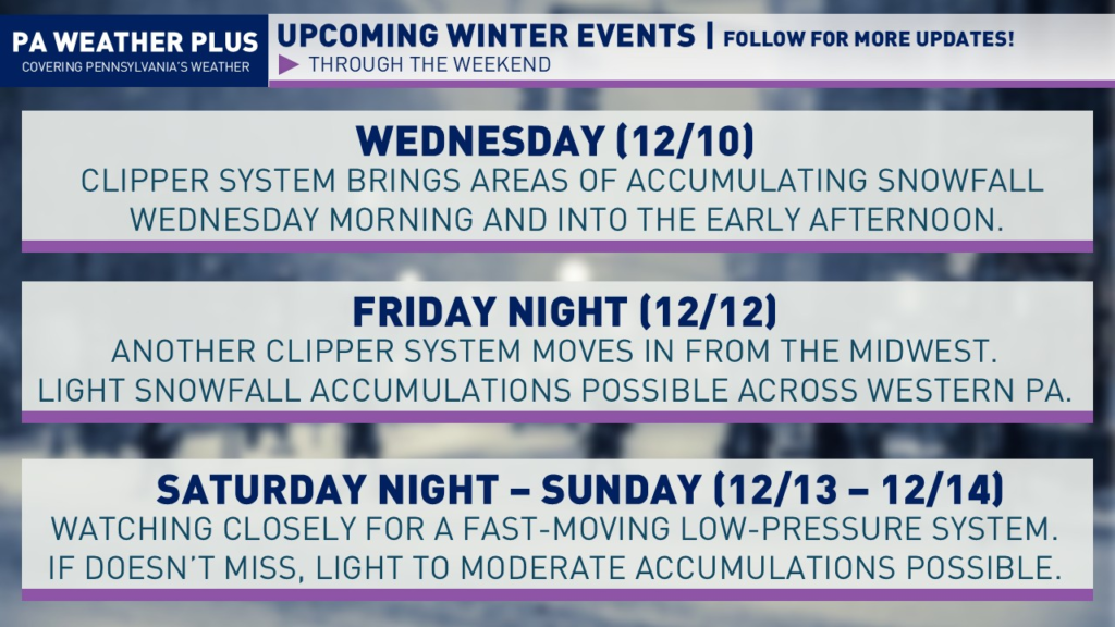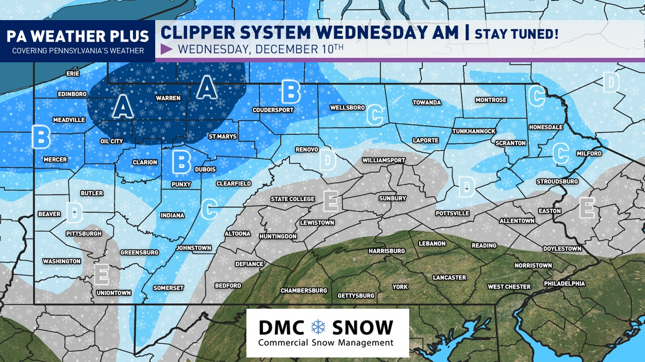 Ever since the event last Tuesday, most of the snow has tracked south of Pennsylvania and into the southern portions of the Mid-Atlantic. This next clipper will finally track north enough to bring us light snowfall accumulations for Wednesday morning and into the early afternoon. The best of the accumulating snow will mostly remain in the higher elevations due to marginally cool temperatures, but many will see at least some ‘festive’ flakes. There has been an increase in snow amounts across northwestern Pennsylvania over the last 12 hours.