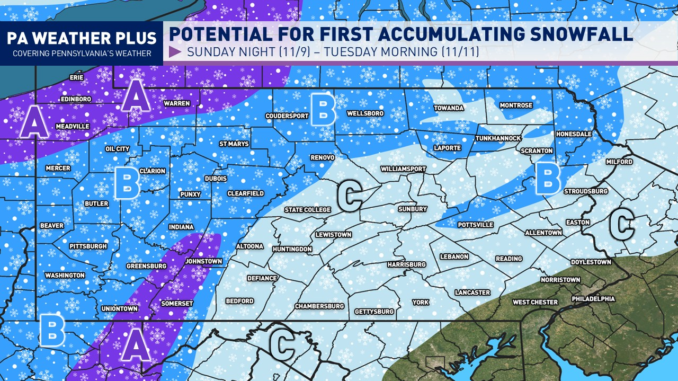 By Tuesday morning and the afternoon, the coldest air of the system will wrap through Pennsylvania. This will turn on the lake effect snow machine with possible moderate to heavy snowfall rates across northwestern Pennsylvania. Snow showers and snow squalls may be able to reach into much of central Pennsylvania.