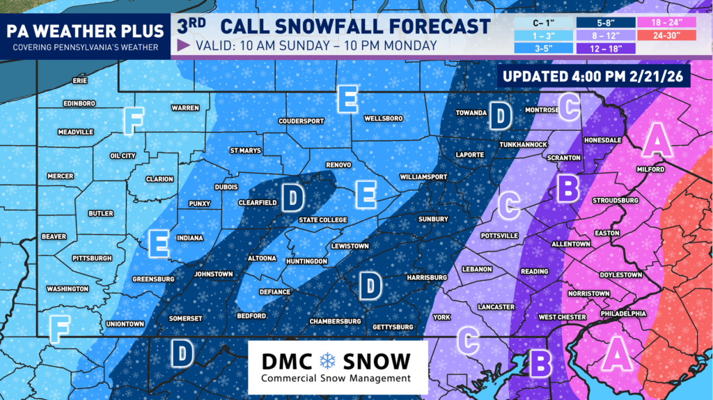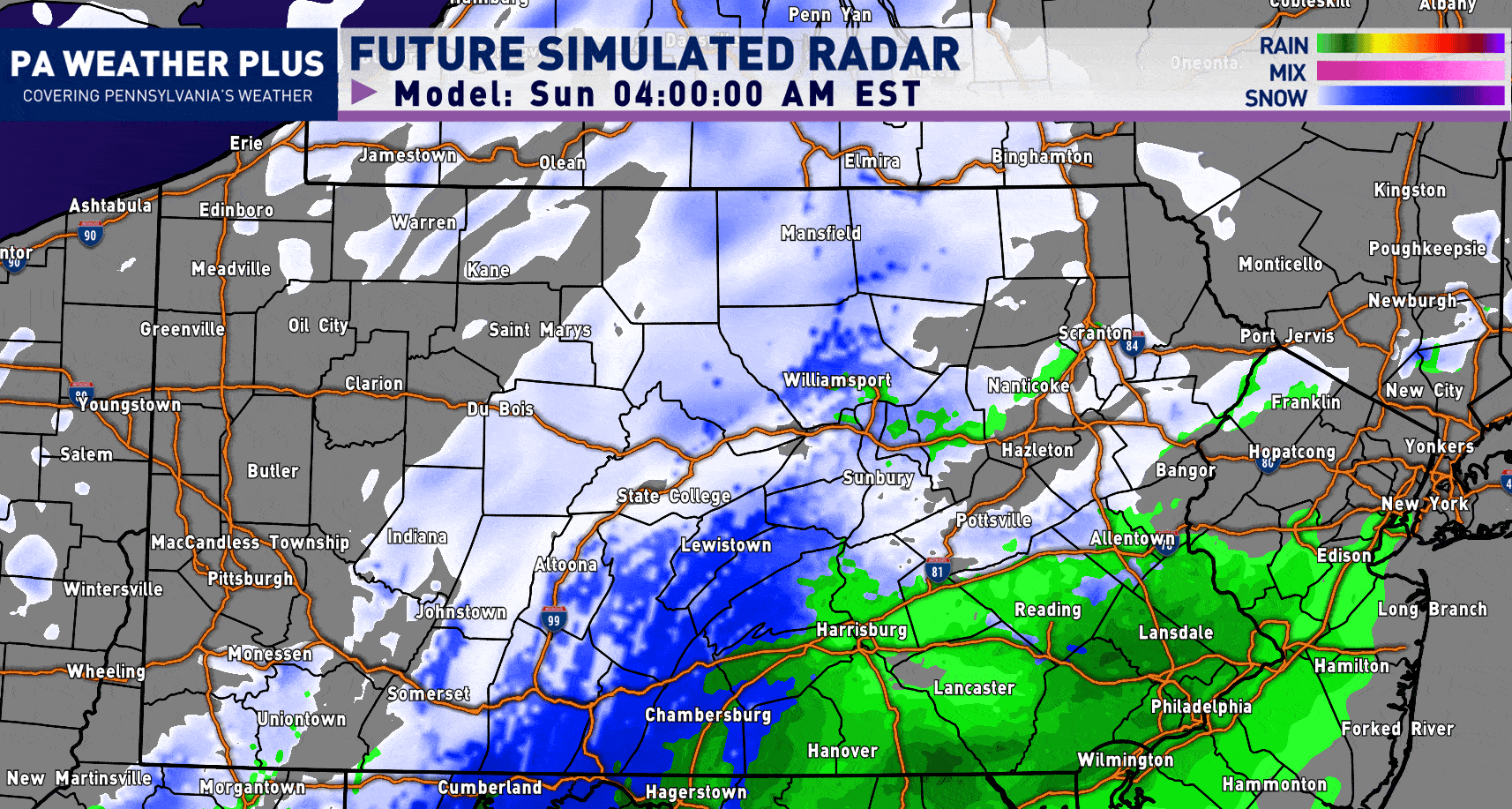 We have a major winter storm on our doorstep with the first flakes set to fall in as little as 12 hours. What appeared to be a miss to the east, we have seen a significant shift westward and amplified for the last 48 hours and here is where we land. A Major East Coast winter storm is expected, with the worst of the impacts in Pennsylvania holding to far eastern regions. Nevertheless, *EVERYONE* will see some sort of snowfall impacts Sunday morning through Monday evening.