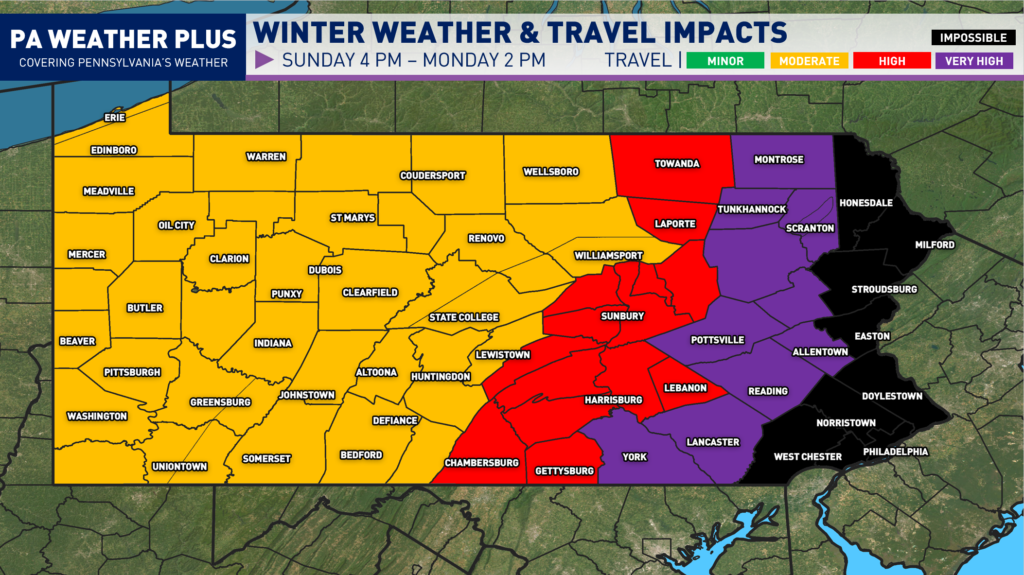 Worst Period of Snow: Sunday Late Afternoon through Monday Early Morning. Expect steady snowfall rates with falling temperatures and increasing wind gusts. It is highly recommended you stay off of roadways during this time period, especially across central and eastern Pennsylvania. This will be the worst period of this significant winter storm. Snowfall rates of 1 to 3 inches an hour will be expected across much of eastern Pennsylvania.