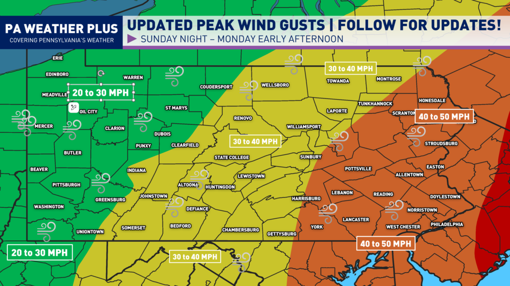 Due to the rapid strengthening of the low pressure system offshore, we will see stronger wind gusts across much of the state, focused across eastern Pennsylvania. Gusty winds will lead to isolated power outages in the 30 – 40 MPH zone, and scattered to perhaps numerous in the 40 – 50 MPH zone. The snow will initially be wet and heavy, which will stick to trees and powerlines. Once the winds begin to pick up late Sunday night, we may see powerlines and trees begin to come down, mostly across eastern Pennsylvania. If you are prone to losing power, please make sure you are prepared and follow safety tips down below.