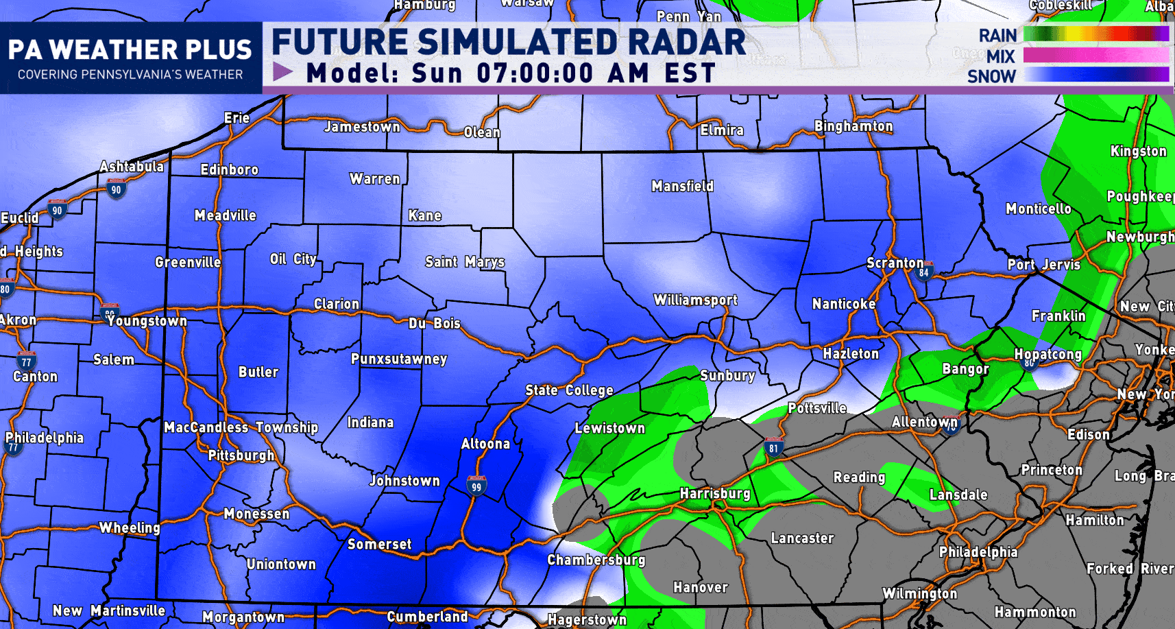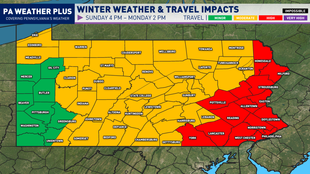 Worst Period of Snow: Sunday Late Afternoon through Monday Early Morning. Expect steady snowfall rates with falling temperatures and increasing wind gusts. It is highly recommended you stay off of roadways during this time period, especially across central and eastern Pennsylvania. This will be the worst period of this significant winter storm.
