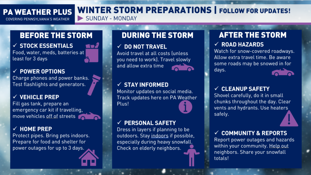 Here are some winter storm preparation tips: Make sure you stock up on essentials like food, water, medications, and batteries, and charge your phones and power banks ahead of time. Fill your gas tank, prepare your vehicle, and avoid unnecessary travel during the storm if possible. If you are prone to power outages (mostly applies to Area A), make sure you have enough food and water to last at least 3 days! Stay informed by monitoring the latest forecasts and updates, use caution when shoveling snow and traveling on icy roads, and check on neighbors. Report any power outages or hazards in your community and continue to follow PA Weather Plus for updates.