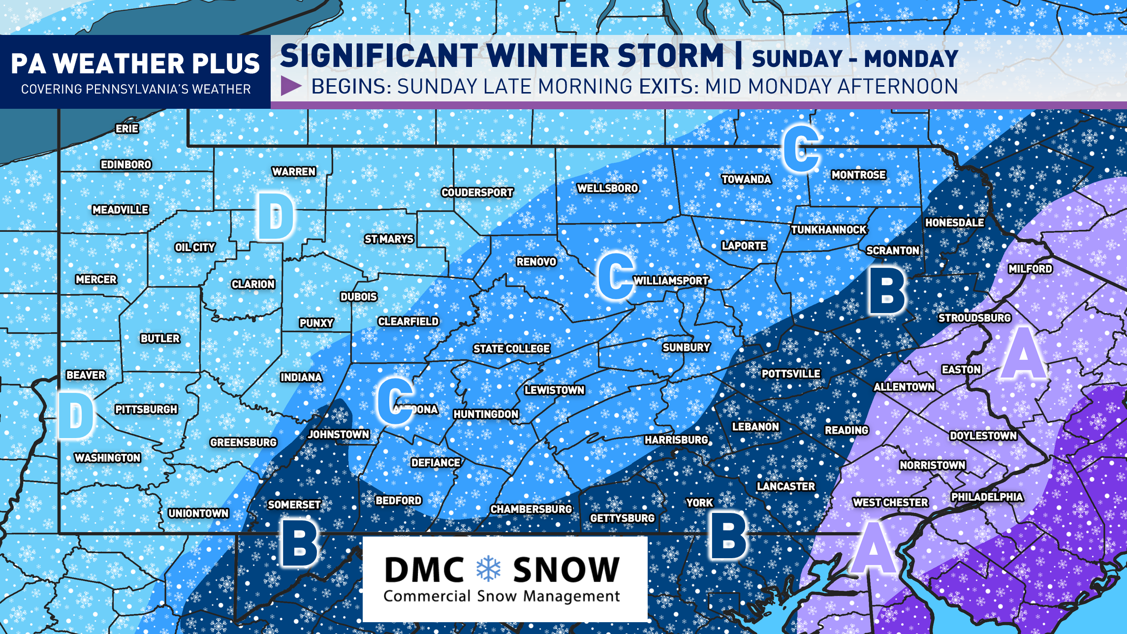 We have another significant winter storm on our doorstep, which will bring impacts to much of the state beginning Sunday afternoon and lingering through the first half of Monday. Back on Wednesday, I released potential scenarios with this setup. At the end, it appears Scenario #3 will be the closest to verification, as we’ve seen a significant uptrend toward a strong coastal low-pressure system, wrapping moderate to heavy snowfall into much of Pennsylvania. Up to a foot of snow will be possible across eastern Pennsylvania, with less snowfall the farther west you are located. No matter how much you get, everyone will see some sort of impact
