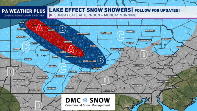 Once the cold front passes through Sunday morning, the lake effect machine will turn on by Sunday afternoon. Expect snow bands and squalls to begin to develop throughout the state. Some impacts may begin to occur, especially across northwestern Pennsylvania where temperatures will be the coldest.
