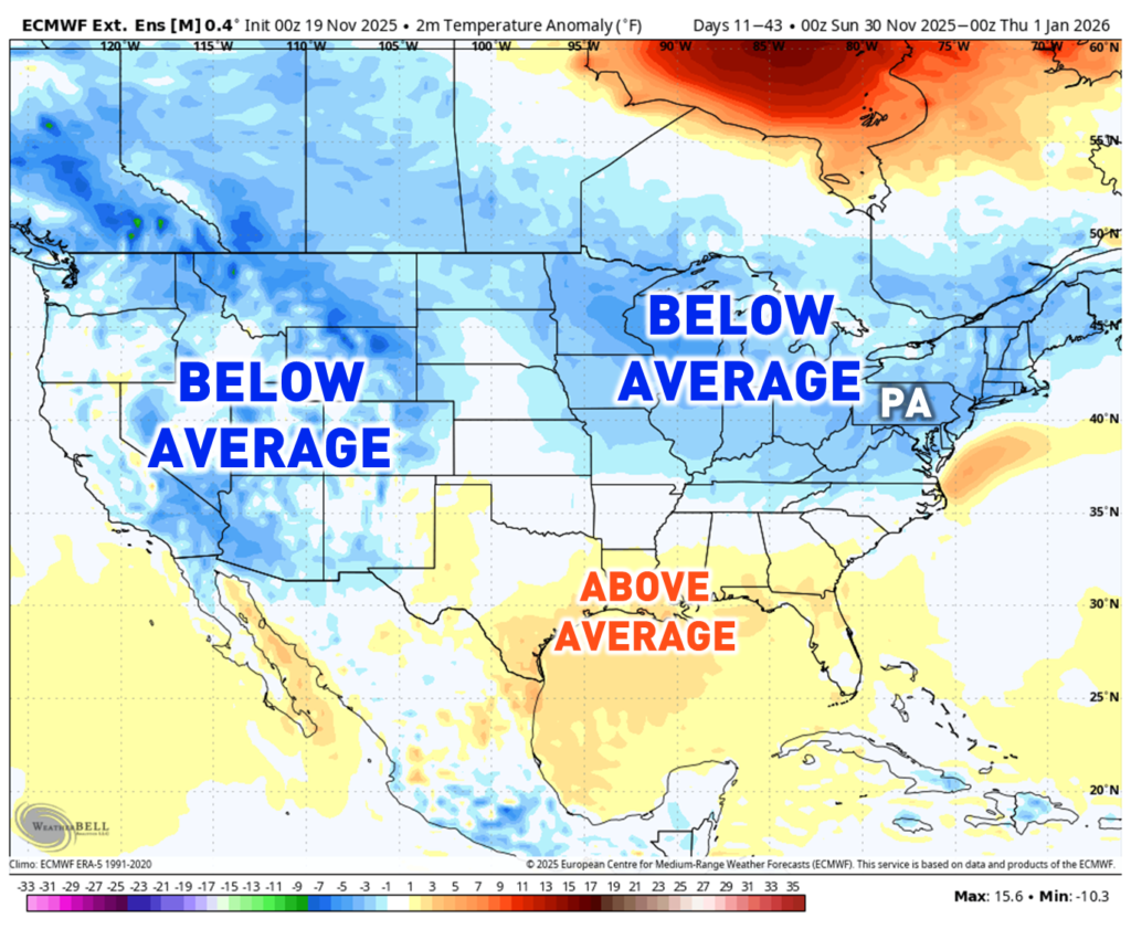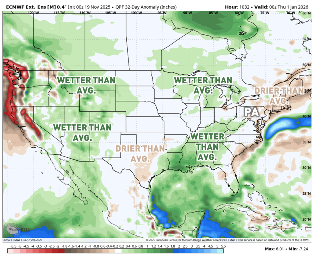 The extended European Model Ensemble Suite is being shown. There are some differences across different portions of the United States. However, the story holds the same in Pennsylvania. Model guidance is backing the ideas for below-average temperatures and near to below-average precipitation across Pennsylvania. I noticed a key detail. There is a wetter-than-average signal across the south-central United States. This could indicate a potential active storm track out of the Gulf.