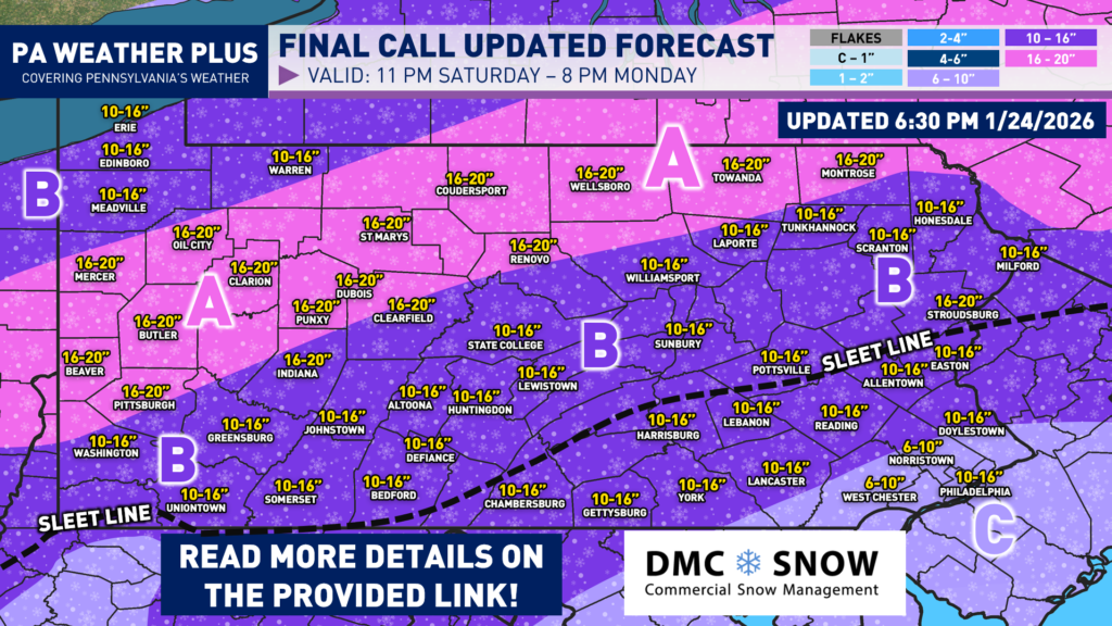 The time is here. After tracking the winter storm all week with dramatic northward shifts, we are now within 24 hours of the beginning of one of the largest winter storms to impact the state in several winters. In fact, this is the first time since the Presidents’ Day Storm in 2003 that all 67 counties in Pennsylvania are under a Winter Storm Warning.