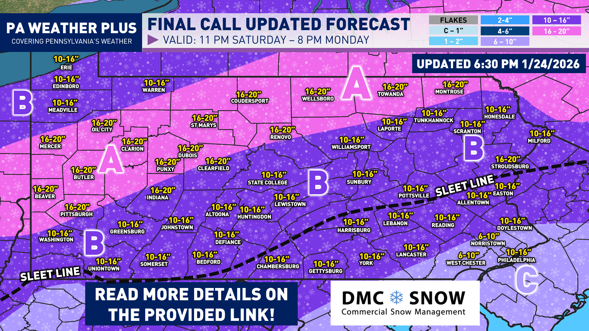 AREA C: Snow amounts of 6 to 10 inches. Sleet amounts up to 1 inch are possible, making for even worse travel conditions. Roadway conditions with snow and sleet combined will likely lead to very hazardous travel conditions Sunday through Monday morning. Schools and businesses will likely remain closed on Monday.