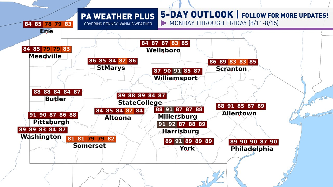 MONDAY (8/11): High temperatures ranging from the mid-80s to low-90s. Expect mostly to partly sunny skies. Heat indices will range from the mid-80s to mid-90s, with the highest heat indices across western PA. Winds out of the south at 6 – 12 mph.