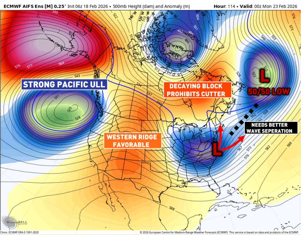 Friday’s storm setup encourages a 50/50 low and a weakening eastern Canada block, limiting a cutter track. Overall, this pattern supports the potential for a significant winter storm.