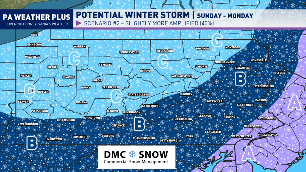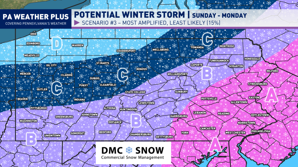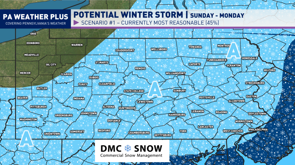 This scenario is currently the most favored, which will likely still bring in some snow to much of the state with a glancing blow to the east of Pennsylvania.
