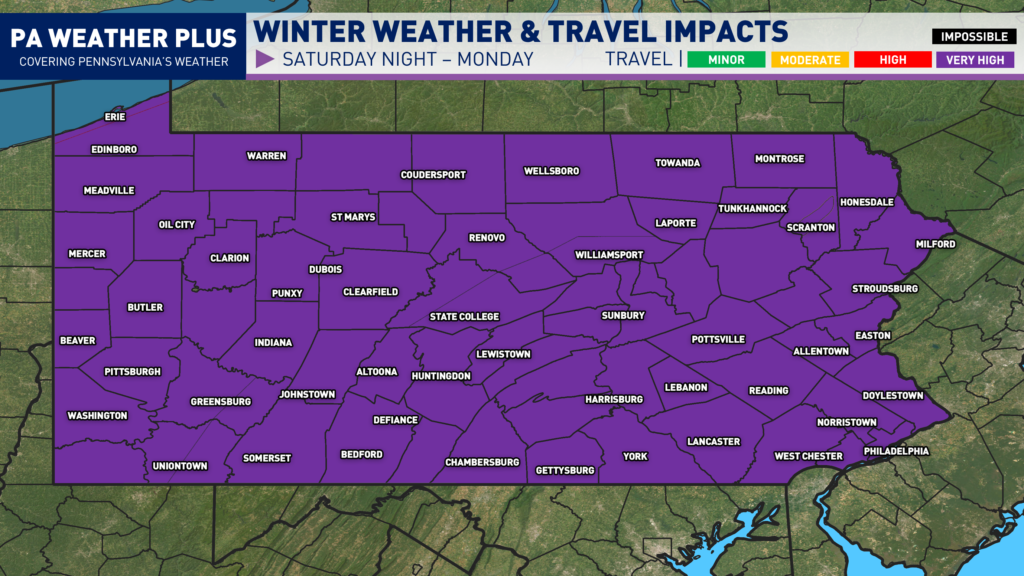 Snow will be moving into Pennsylvania southwest-to-northeast Saturday evening through early Sunday morning. The start of the storm has trended slower over the last few model cycles. Once the storm begins, the conditions will worsen quickly. All day on Sunday will likely have very hazardous to at times impossible travel conditions with bands of heavy snowfall. Snowfall rates of 1 to 2 inches per hour are expected. The snow looks to continue into Monday morning before tapering off Monday afternoon. If you have travel plans Sunday through Monday morning, it is now time to cancel and reschedule!