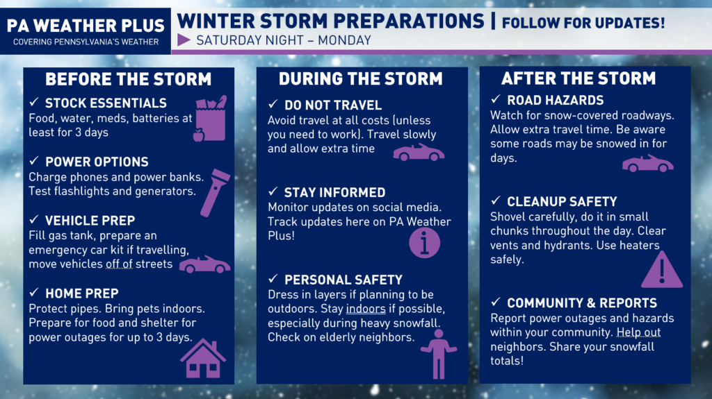 Here are some winter storm preparation tips: Make sure you stock up on essentials like food, water, medications, and batteries, and charge your phones and power banks ahead of time. Fill your gas tank, prepare your vehicle, and avoid unnecessary travel during the storm if possible. If you are prone to power outages, make sure you have enough food and water to last at least 3 days! Stay informed by monitoring the latest forecasts and updates, use caution when shoveling snow and traveling on icy roads, and check on neighbors. Report any power outages or hazards in your community and continue to follow PA Weather Plus for updates.