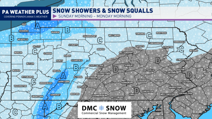 Snow showers and snow squalls will begin to break out across western Pennsylvania shortly after sunrise on Sunday. Some of these snow squalls could be intense, especially near Erie and Pittsburgh.