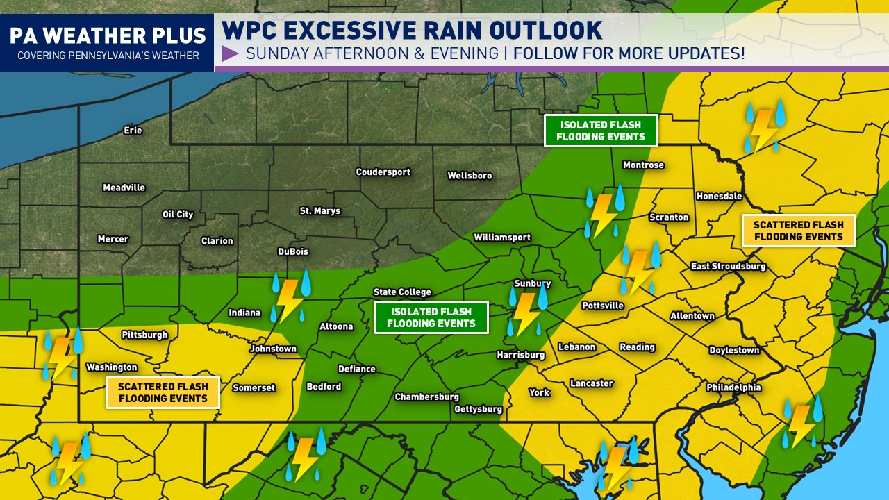 By the mid-afternoon hours, the greatest storm coverage will be across the southern tier of the state. A few sub-severe storms may fire across northern Pennsylvania. This will be our prime time for more stronger thunderstorms that can contain gusty winds of 40 – 60 mph. Additionally, heavier thunderstorms may pose a risk of flash flooding, especially with some areas that may receive more than one storm. This is already an elevated threat with the recent rainfall events leading to saturated soils. Flood-prone and low-lying regions will be at the highest risk. Please remember to turn around, don’t drown!