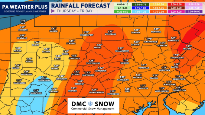 - A dynamic setup will increase rainfall, especially in central and eastern Pennsylvania, with predictions of 1 to 2 inches of rain.