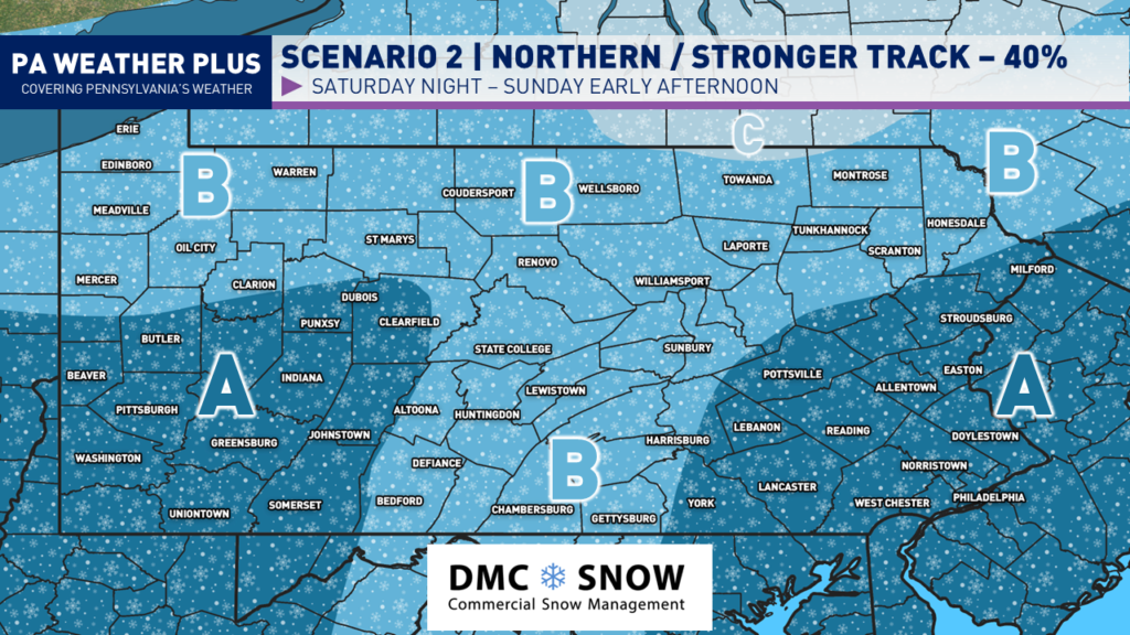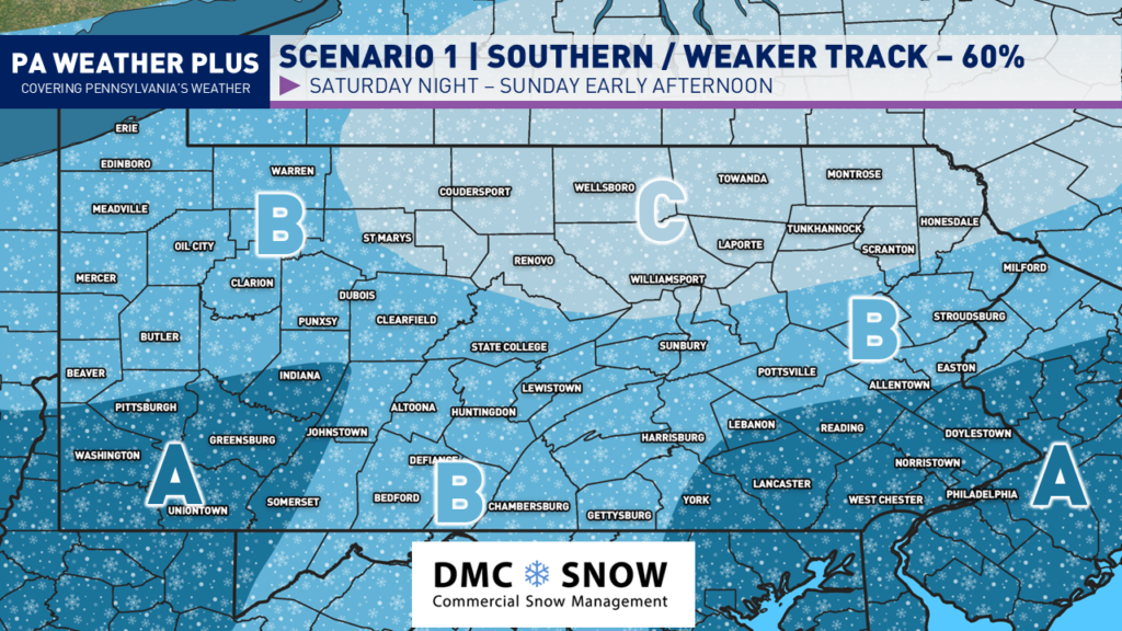 Over the past few model runs, there has been a consistent southern / weaker trend with our weekend storm system. This would suppress the highest snowfall amounts to the far two southern corners of the state.