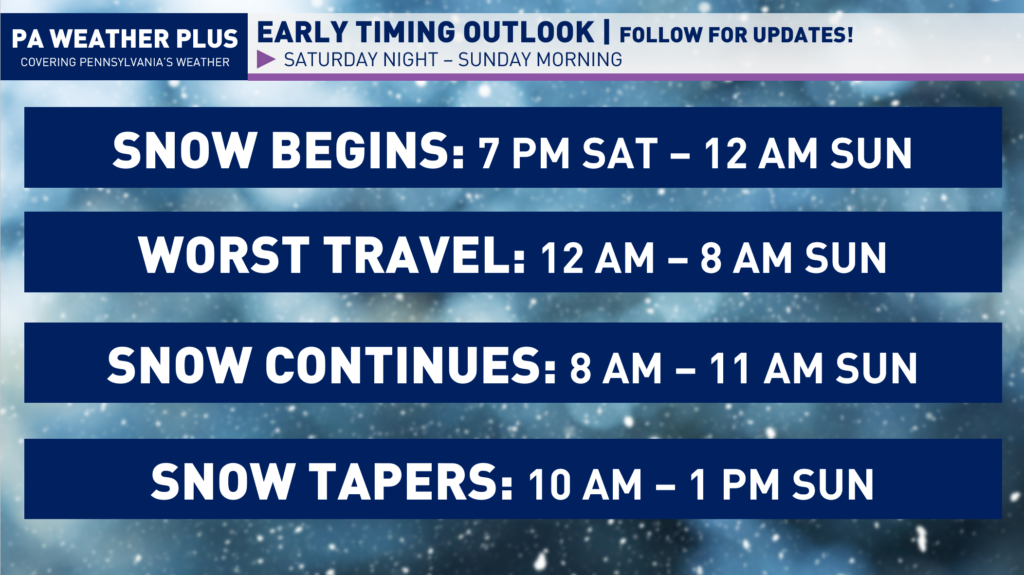 While a weaker versus stronger storm will have some differences in the timing, here is a general outline of when the snow arrives, the bulk of the storm, and when the storm is looking to exit. The worst of the travel will likely be overnight and into early Sunday morning, where the steadiest snow coincides with colder temperatures. The snow will begin to taper off Sunday morning and move out by early Sunday afternoon.