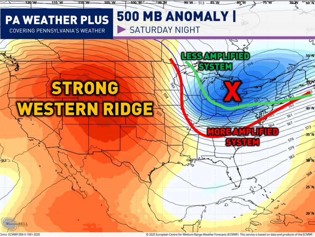 A “flatter” trough (green line) will lead to a less amplified and much weaker system. A “deeper” trough (red line) will lead to a more amplified and stronger system. The scenarios are not that extreme, but I drew those two to envision the differences.