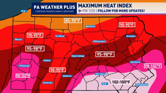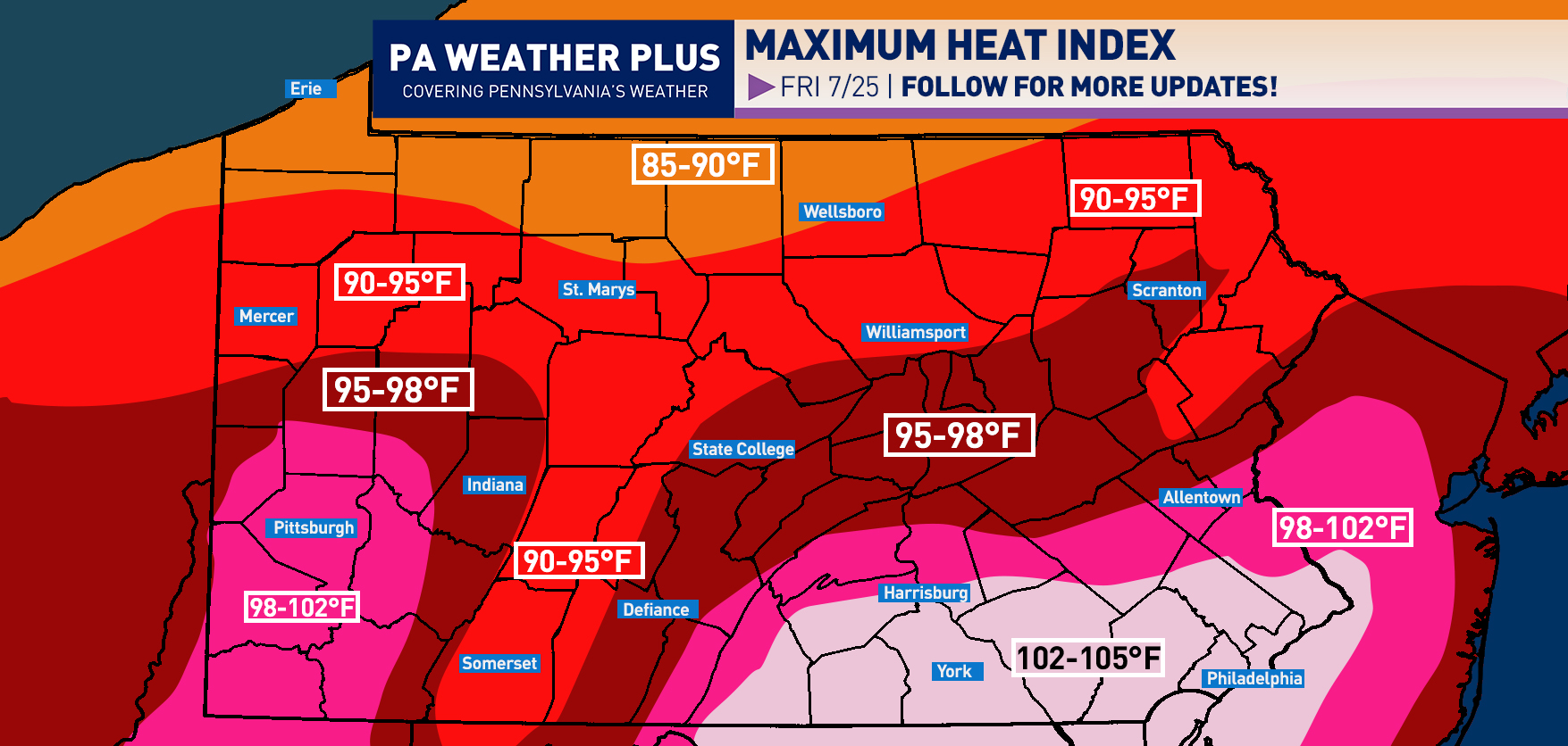 Here is an early look at the *MAXIMUM* heat index expected Friday afternoon. The very high dew points combined with higher temperatures will make for DANGEROUS heat indices, especially across southern PA. Pittsburgh, Harrisburg, York, Allentown, Lancaster, Doylestown, and Philadelphia will see heat indices climb into the upper-90s to lower-100s. If you plan on being outdoors Friday afternoon, please stay hydrated (DRINK WATER!!!) and avoid strenuous activities during the hottest parts of the day (12-4pm). Check on elderly neighbors often, and do not leave children, pets, or anyone unattended in vehicles. Stay tuned and follow for more updates.